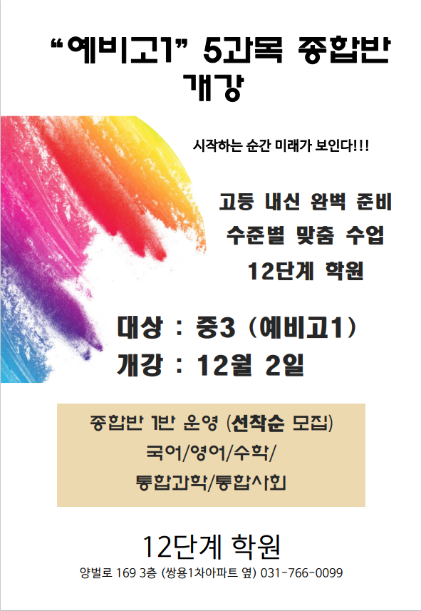 12단계학원 2025년 예비고1 종합반 12/2 개강!! 12단계학원 24-10-23 19:04 74 0 2025년 예비고1 종합반이 12/2일에 개강합니다. 댓글목록 등록된 댓글이 없습니다. 이전 목록 다음